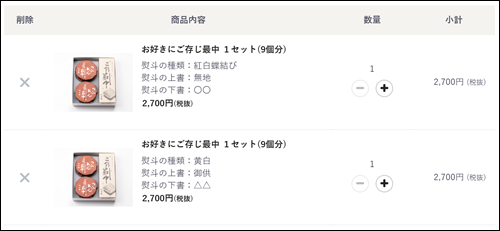 カートに入れる際「熨斗の種類」「熨斗の上書」「熨斗の下書」が同じ場合は数量が追加され